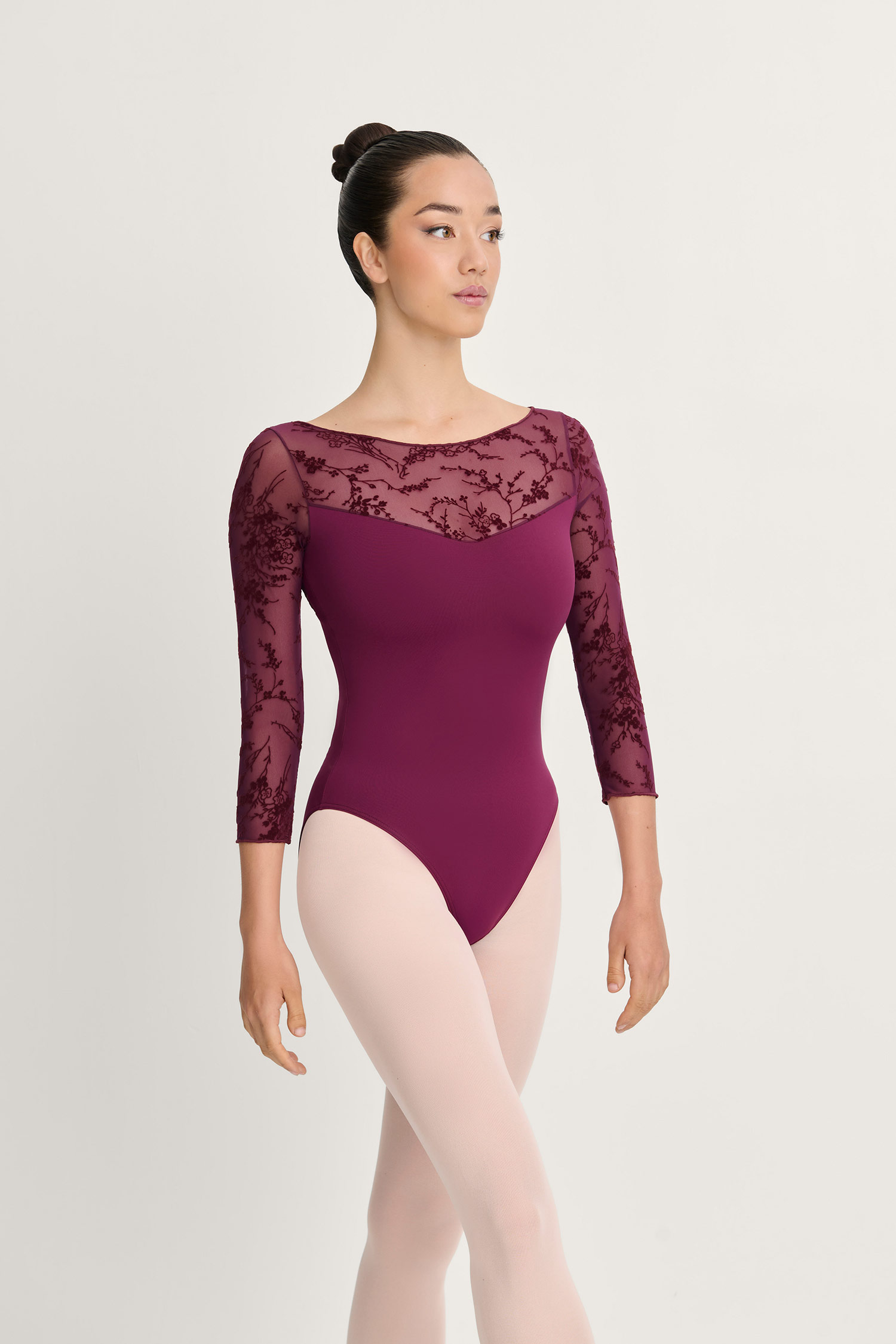 Maillot de mangas  3/4 con cuello barco sin elástico combinado con tul flocado a tono en escote, espalda y mangas.  Forro delantero tacto suave.