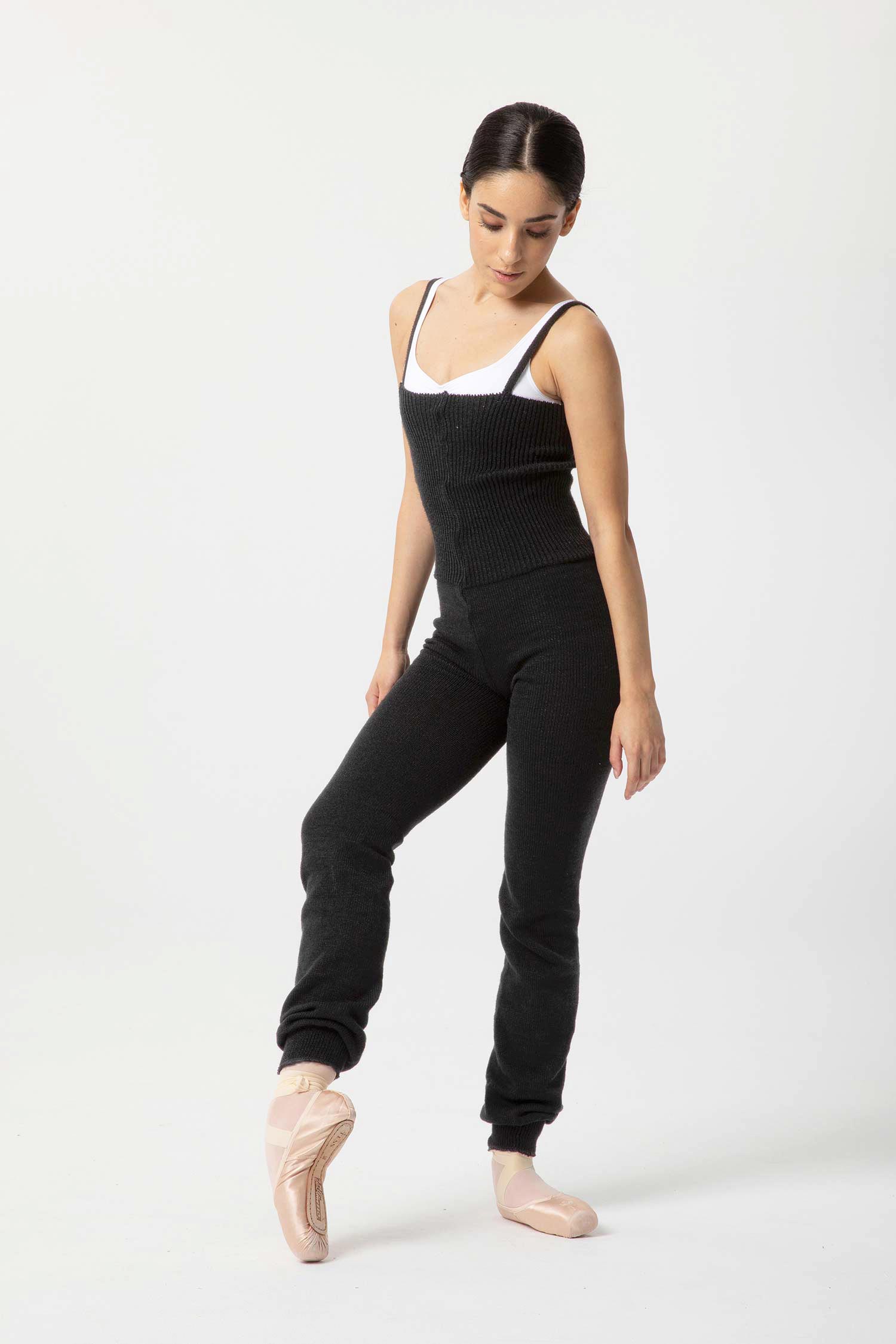 Mono entero largo de tirantes con canalé 1×1 hasta la cintura y puño en el tobillo, 100% acrílico.