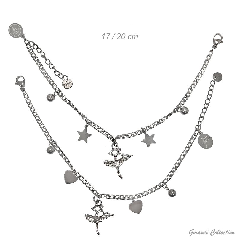 Pulsera  » Girardi» de cadena de acero de eslabones redondos con baño de rodio hipoalergénico con charms de bailarina y corazones o bailarina y estrellas.