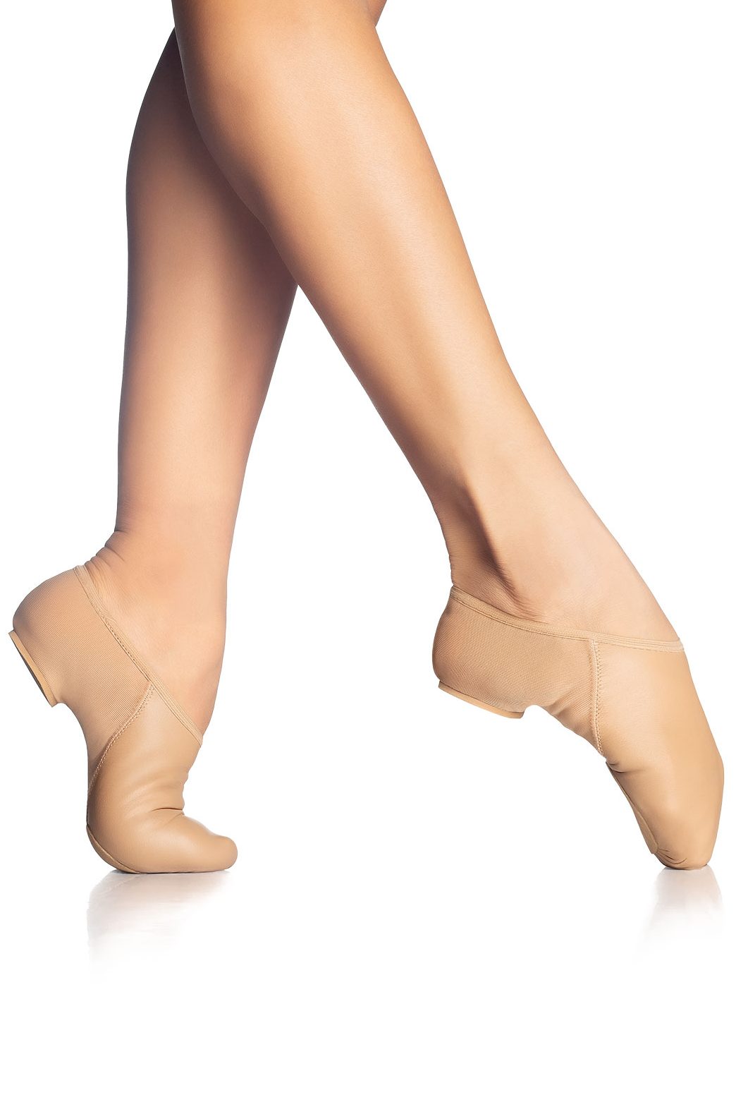 Zapatilla de jazz fabricada en piel y Nylon Spandex con suela de gamuza y tacón de goma fino.